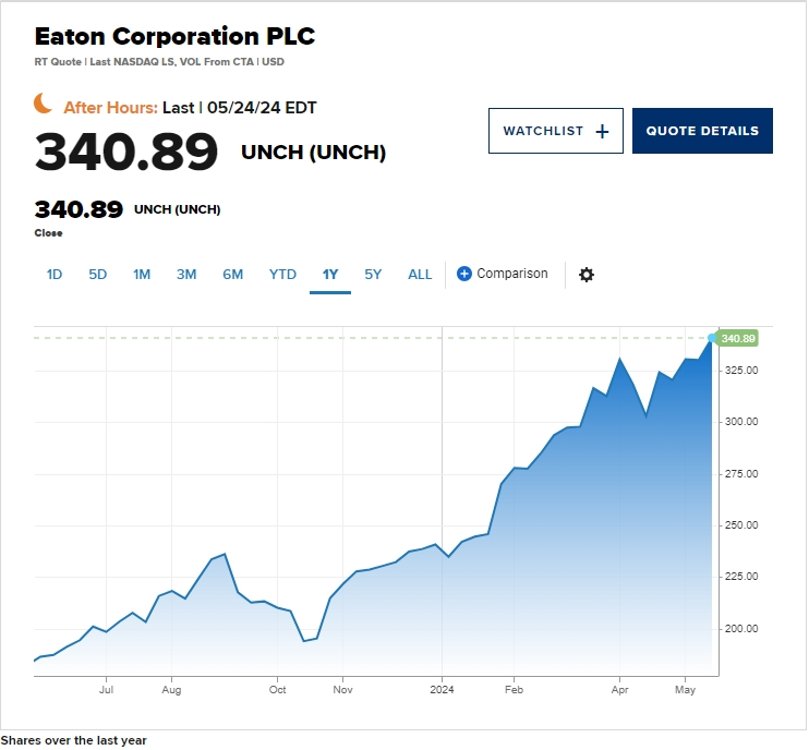 自2024年初以来,Eaton(ETN)上涨了超41%,过去一年上涨了约103%。该公司制造电气部件和配电系统,涉足各种终端市场,包括航空航天、汽车和充电。