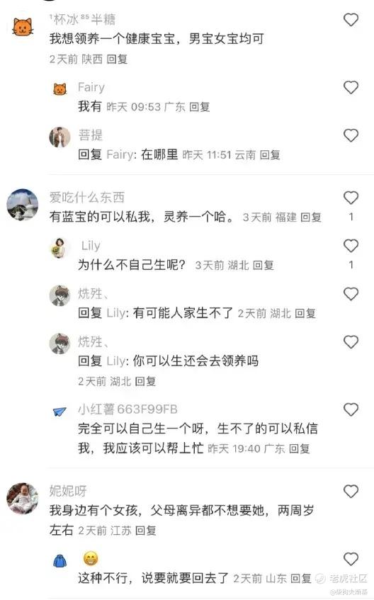 咱先不说这个要领养孩子的为啥不自己生,或者生不出来不去正规渠道领养的问题,就说评论区这些表示自己有孩子可以被领养的,这些孩子是怎么来的?是自己生的吗?还是拐卖交易而来?