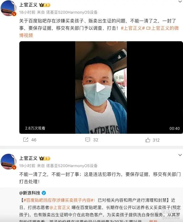 昨日,上官正义再次爆料,在百度贴吧里,长期存在公开以送养名义买卖孩子的违法行为。