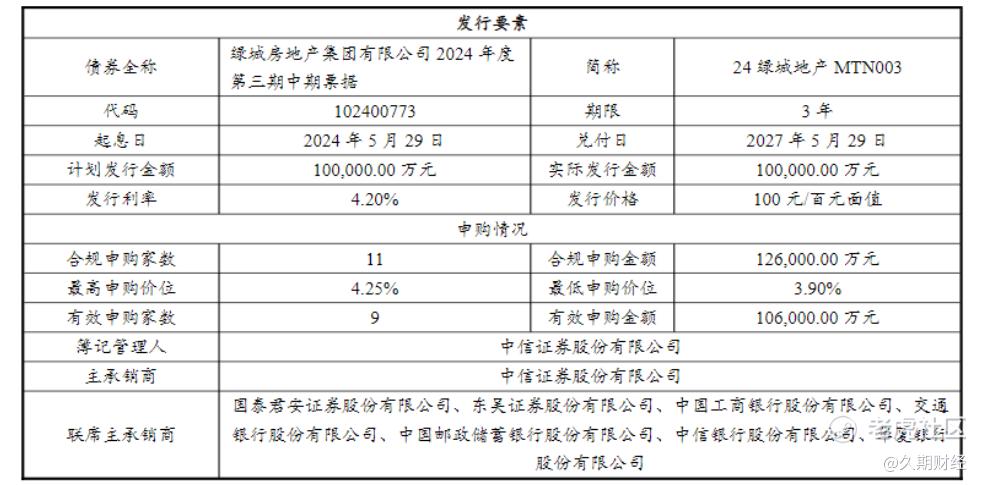 久期财经讯,5月29日,绿城房地产集团有限公司(简称“绿城房地产集团”)于2024年5月28日发行了绿城房地产集团有限公司2024年度第三期中期票据,现将发行申购、配售、分销、募集资金用途情况公告如下:
