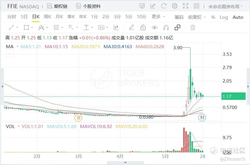 但是,在没有出现任何利好消息的情况下,法拉第未来的股价从5月10号的0.0426美元/股一路上涨至5月17号的最高3.9美元/股,涨幅超过9000%,本周二法拉第未来收盘价1.17美元/股,截至周二收盘,法拉第未来股价5月份共上涨2979%。