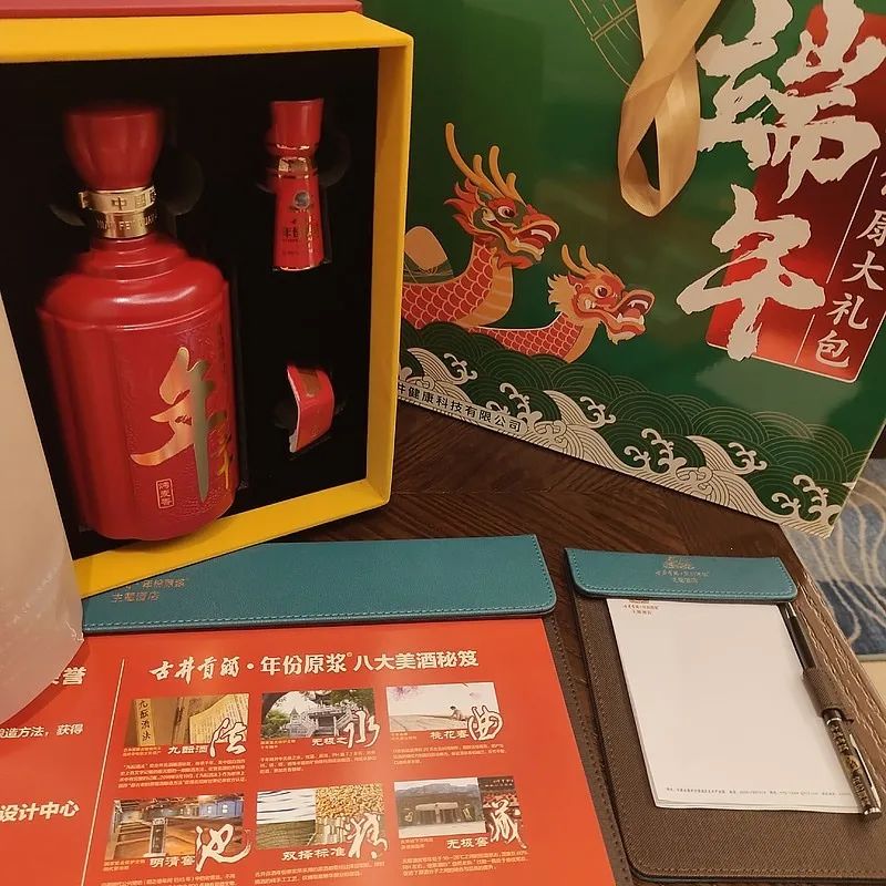签到,发嘉宾证、自助餐券(晚饭、第二天早上、中午都是自助)、拿好伴手礼(年三十礼盒装,价值1680;端午健康大礼包,里面是古井旗下的大健康产品如酵素饮料、养生茶包数盒、香包)