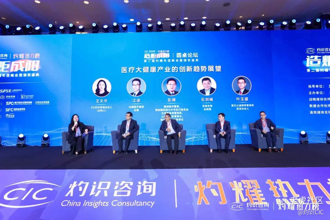 从左至右依次为CIC灼识咨询合伙人王文华、达康医疗集团总裁江波、微创医疗董事|微创集团前大中华执行委员会主席兼首席营销官|心脉医疗前董事长|微创脑科学前董事长彭博、圣美生物总经理石剑峰、竞天公诚律师事务所资深合伙人叶玉盛
