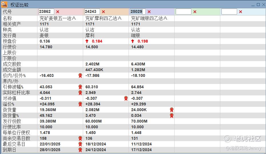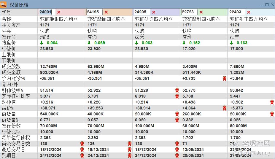 兖煤即市支持位16.7。考虑在支持位附近博反弹,行使价17,2024年9月到期的认购证产品,可以考虑22403,引伸波幅最低,实际杠杆5.6倍。其次可以考虑22723,引伸波幅53%,实际杠杆5.7倍。