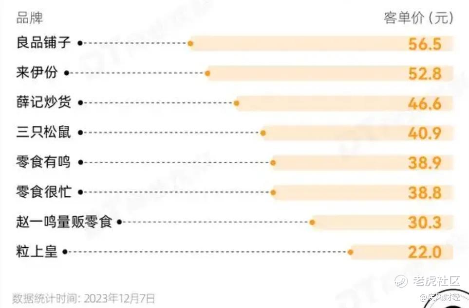 根据第三方数据平台2023年12月统计,良品铺子平均客单价为56.5元,在同行中客单价排行第一。