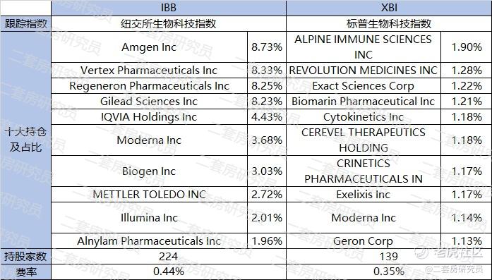 规模/费率:IBB的规模更大,XBI略小一些;费率XBI更低一些;