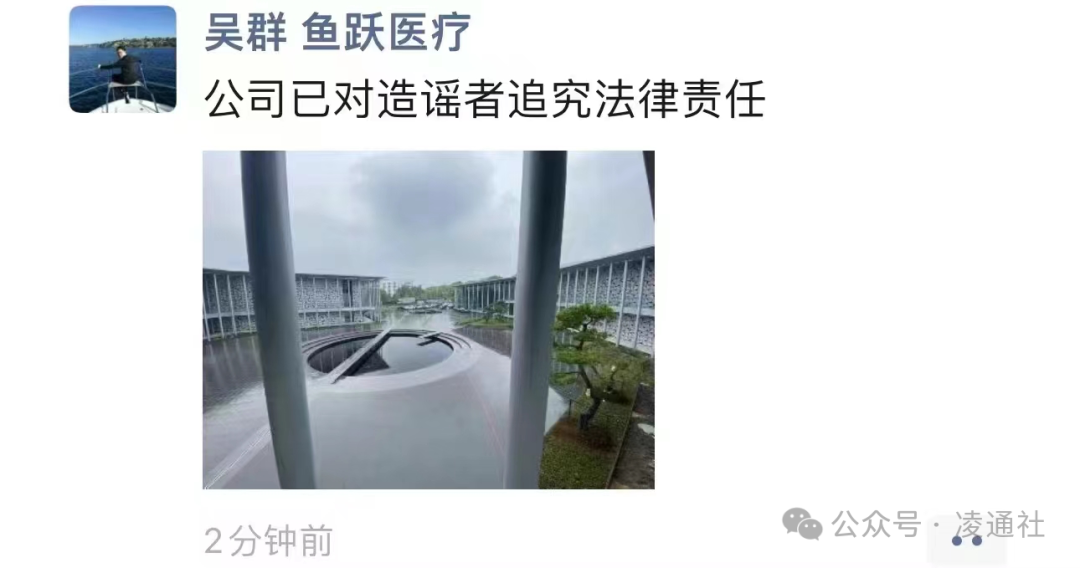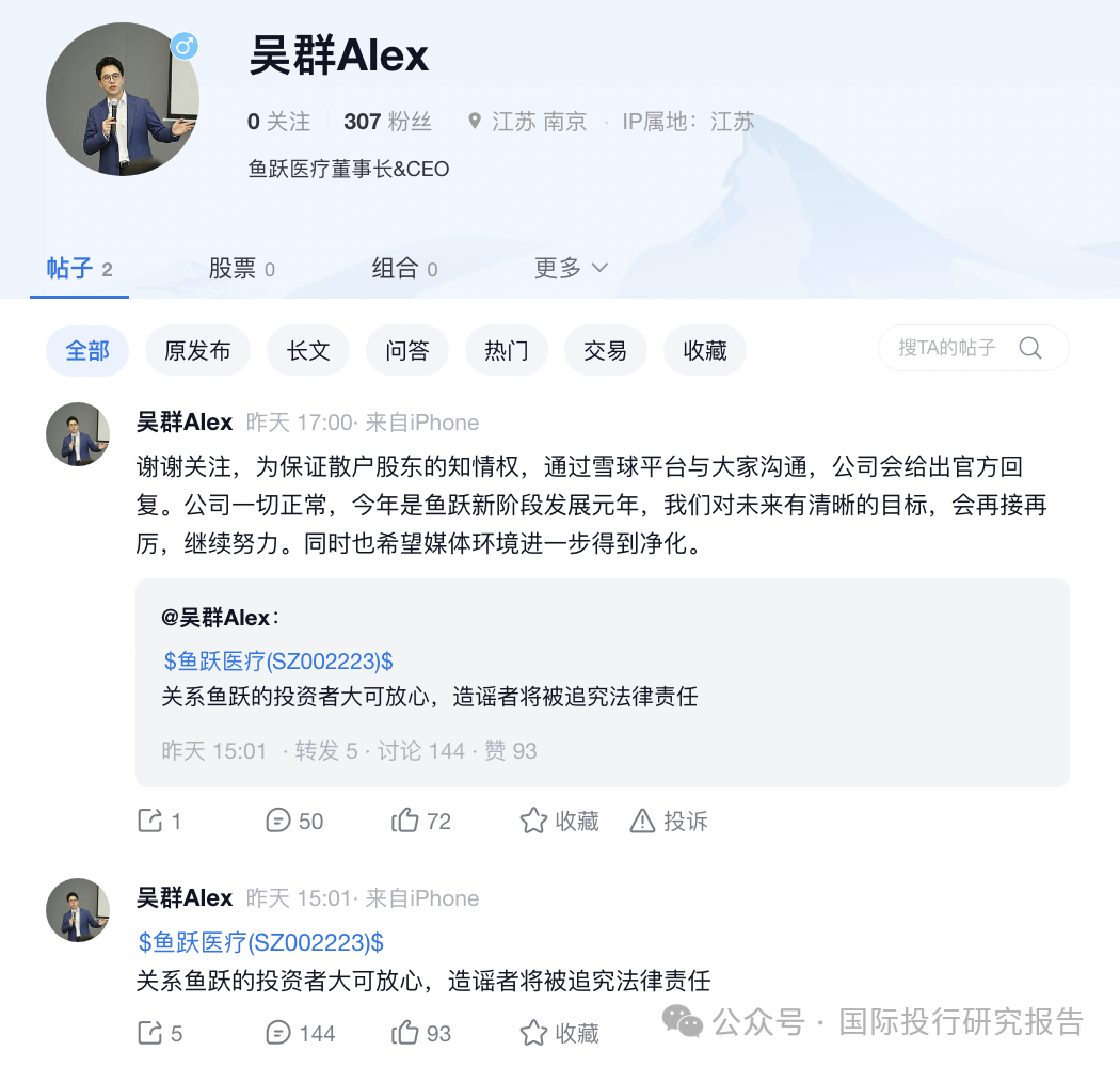 6、昨天,各路媒体向鱼跃医疗求证,回复用词不同,从“已经报案”到“正常上班“等不同,吴群则发了一个是谣言的朋友圈,自己在接受21采访是表示自己没有接受过调查。而澎湃新闻说晚上要公告。最后吴群却在某球的307个粉丝的账户上发表了正式表态。而吴光明并未有任何表态!看出来,鱼跃医疗各路人马有点不协调到手足无措。