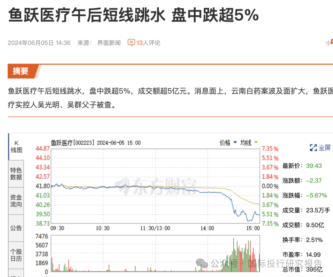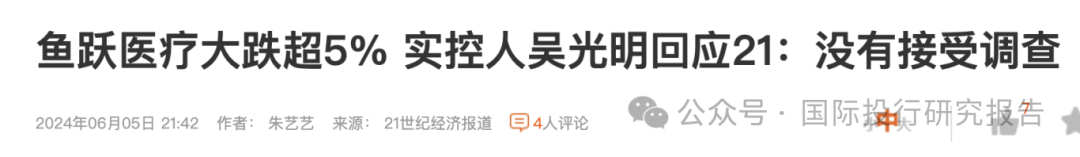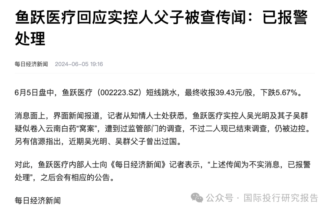 鱼跃医疗昨天因界面新闻”实控人吴光明、吴群父子也涉及此案,二人此前也已经历监管部门的调查,不过现已二人已结束调查,同样被边控”的新闻而跳水,综合媒体报道,鱼跃医疗对此进行了否认,但从文字看并不是强硬得干干净净,比如说报警了,就应该晒出报警回执,记得昨天澎湃新闻说晚上有公告,结果是没有。