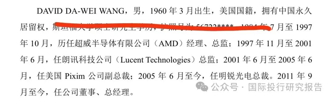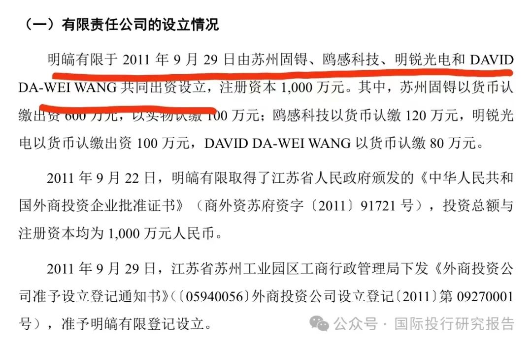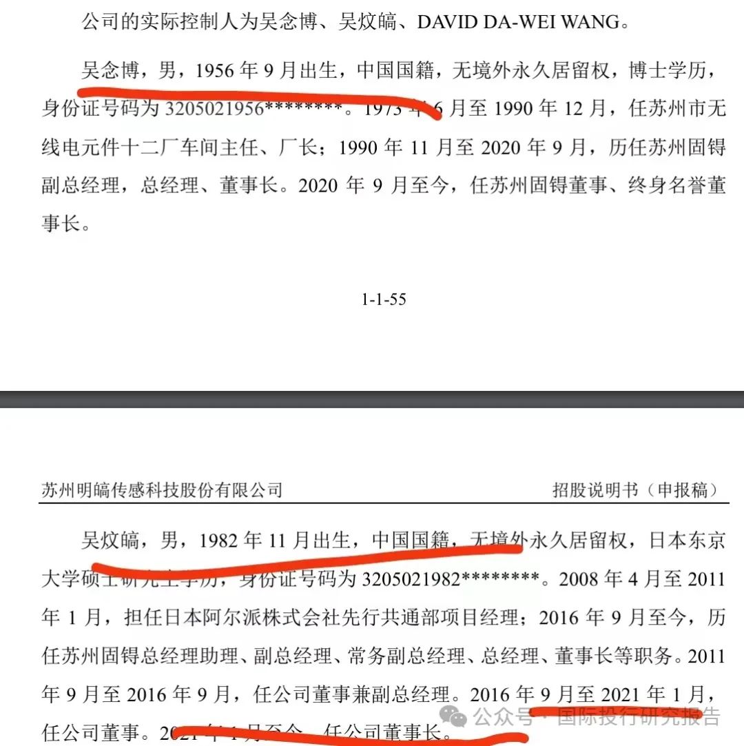 2、明皓传感的一致行动人是吴念博、吴炆皓、DAVID DA-WEI WANG ,吴念博是苏州固锝的董事长,吴炆皓是、明皓传感的董事长,二人是父子关系,DAVID DA-WEI WANG美国国籍的是技术主理人,却在中国永久居留权。所以,明皓传感的基本框架就是一个美国人技术,然后老子出资,儿子和技术派一起成立了一个公司。