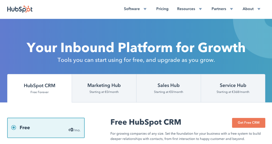 尽管大多数 SaaS 公司专注于通过控制CAC来增加客户的长期价值,他们不应该害怕打破现有的市场战略,来减少 CAC。HubSpot 将其营销产品应用到 S 曲线框架中,并且看到它已经接近成熟。该工具仍然是该公司最成功和最知名的产品。然而,它也是一个高销售成本的产品,并有着越来越多的竞争对手。为了在减少 CAC 的同时创建另一条业务线,HubSpot 推出了销售、CRM的客户服务工具。重要的是,市场营销、销售和CRM(见下图)都可以使用免费的版本——人们可以测试产品的免费版本,看到价值,然后转向付费版本。