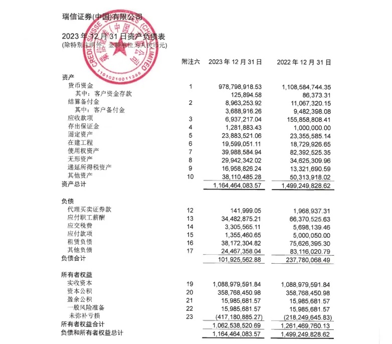 截至2023年12月31日,瑞信证券(中国)的资产总额11.64亿元。