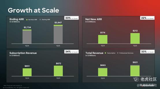 CrowdStrike的主要关注点是ARR(年度经常性收入)的强劲增长。该公司本季度新增ARR净额为2.12亿美元,高于24年第一季度的1.74亿美元。