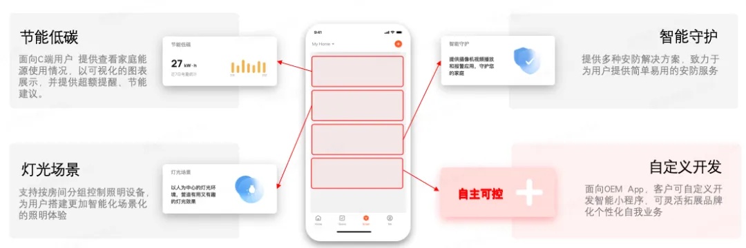 在 HomeSDK 的基础之上,它拓展了一些特定业务场景下的 IoT 能力,比如:设备离线告警、设备备用 Wi-Fi 设置、故障网关替换、批量 OTA、多控关联等等,极大优化用户体验。