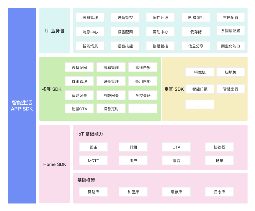 为着力满足不同开发者诉求,涂鸦 App SDK 生态体系为开发者提供了不同层次的解决方案能力,这些解决方案能力是相互兼容,可结合使用的,开发者可按需灵活集成。