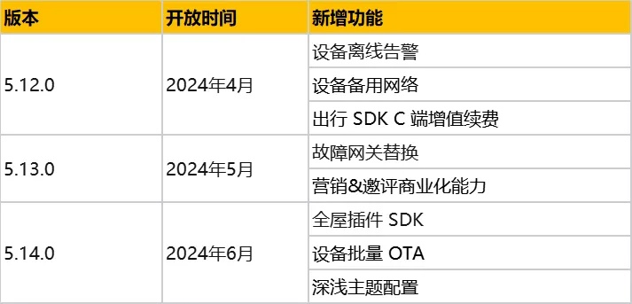 涂鸦 App SDK 是以版本化的模式迭代开放,旨在将涂鸦 App 生态的最新能力尽快开放给开发者接入,目前版本计划如下: