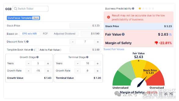 通过Gurufocus的折算模型估算,GGB每股内在价值约为2.63美元。加上每股有形资产约3.43美元,每股总价值约为6.06美元。如果以每股3.26美元购买GGB,获得的安全边际约为46%。
