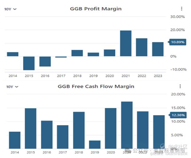 图2. GGB过去10年的净利润率和自由现金流利润率