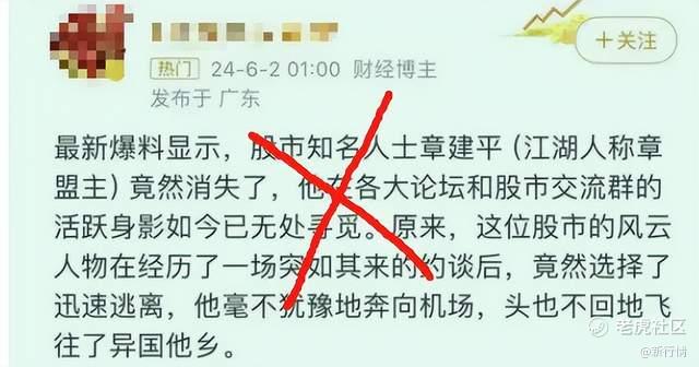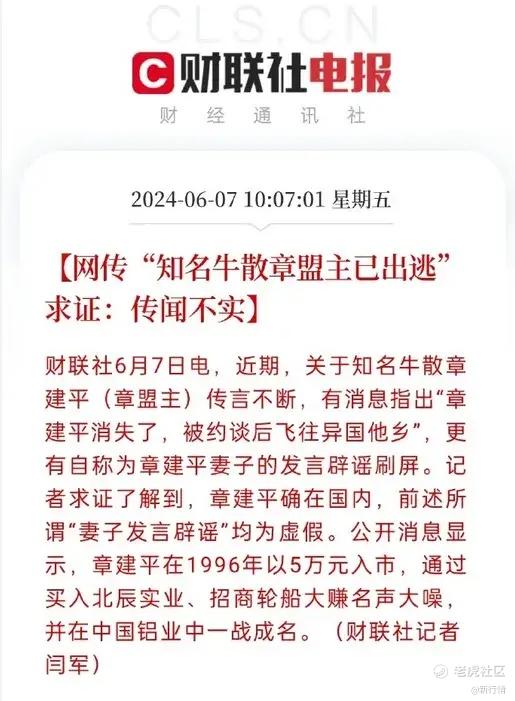 6月7日,另一位游资大佬“股痴流沙河”公开发布澄清公告,称章盟主跑路的消息完全是虚假的,章建平妻子发的澄清回复也是不实消息。