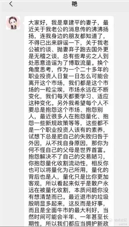 本周,一位自称是章建平妻子的“澄清”文章截图也在投资圈疯传。