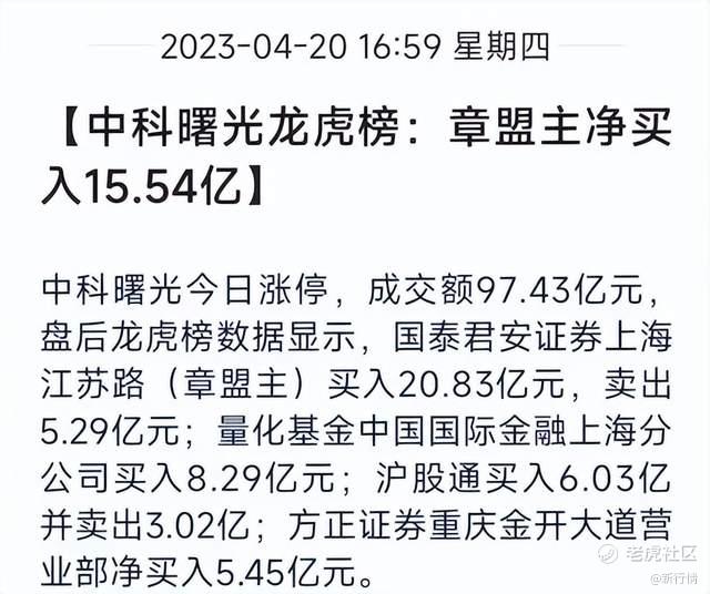 去年4月20日,章盟主大手笔一举买入中科曙光20亿元,创游资单只股票买入的新记录。