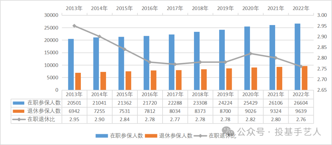 2022年的年度数据中包含了在职参保人数和退休人员参保数据的细分,其中在职参保人数有2.66亿人。这个在职参保人数不仅是在企业和机关事业单位的在职人员,还包括了灵活就业人员。企业和机关事业单位的参保人数分别是2.44亿人和0.66亿人,合计为3.1亿人,如果按照2.76的在职退休比来计算,企业和机关事业单位的在职人员仅有2.27亿人。(实际还会少些,因为灵活就业的退休比例要低很多)