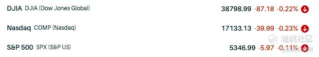 截至收盘,道指跌幅为0.22%;纳指跌幅为0.23%;标普500跌幅为0.11%;