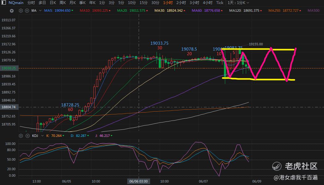 昨晚老美又来了一出戏,前有小非农ADP就业数据严重低于预期,结果周五晚的大非农却显示5月就业人数超预期的强劲,小非农是自动数据处理公司ADP公布的,而大非农是美国劳工部公布,据说劳工部的数据是根据企业岗位的数据模型自动生成,而小非农是对家庭调查数据得出的结果。两个数据再次出现矛盾,而同时失业率又与大非农数据矛盾,达到了4%,这样的数据也让市场一时找不到方向(其实个人觉得,未来不排除美劳工部会对前几次数据进行下修),纳指上半夜震荡走高,下半夜来了个小跳水,指数并没有跌很多,日线是横盘十字星,影响不大,关键还是接下来的CPI,预期纳指周一继续横盘,区间18980-19150