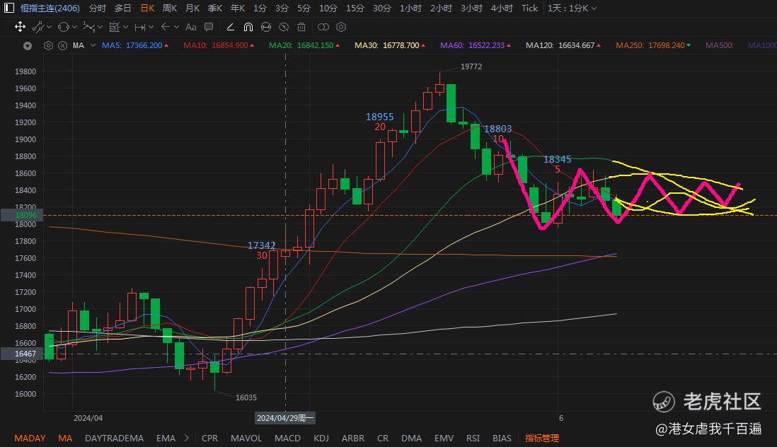 港股周五走得让人失望,冲高无力后倒跌,恒指跌0.8%,科指跌1.9%,旧经济的石油、煤炭、电力那些勉强撑一下恒指,科指只有小权重股的半导体、光学消费电子这些上涨,板块效应太小,掀不起波澜。晚上的夜期,也是周一新的一根K线同样反弹无力,继续下跌,恒指主连收盘18096,科指主连收盘3721,从日线看来,港股整个反弹的趋势已经被破坏,至于下周,我认为指数比较有可能的三种走法: