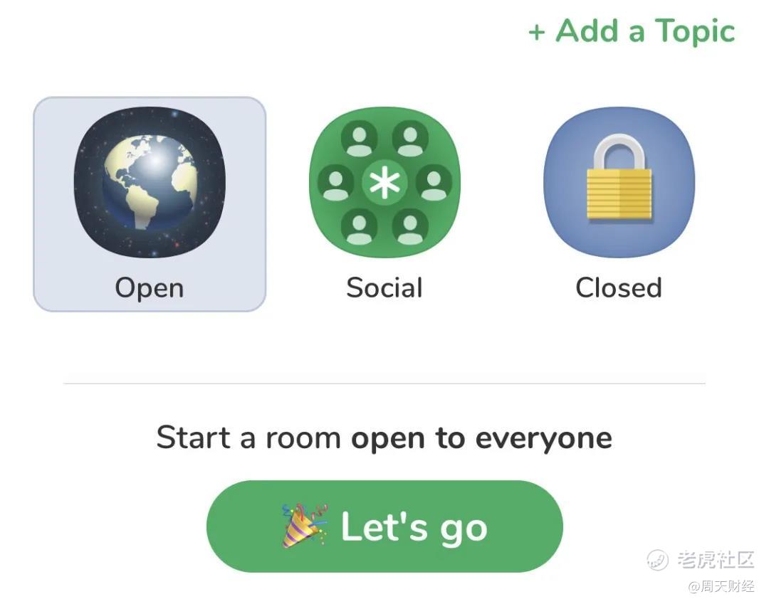 Clubhouse 的聊天室有「公开」、「社交」和「私密」三种属性,对应着公共议题讨论、社**友和私聊三种需求。