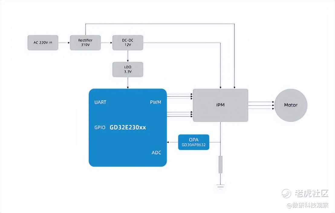 针对冰箱变频应用,兆易创新更是与合作伙伴基于GD32E230xx系列MCU联合开发了变频驱动交钥匙方案,凭借卓越的硬件性能与前沿的控制算法,展现出强大市场竞争力。由于GD32E230xx系列MCU基于ARM® Cortex®-M23内核,最高运行频率达72MHz,相较于市面上基于Cortex®-M0内核的同类产品,它能在保持超低功耗的同时实现更高的运算效能,这对于白色家电变频系统长期稳定运行及优秀能耗控制至关重要。