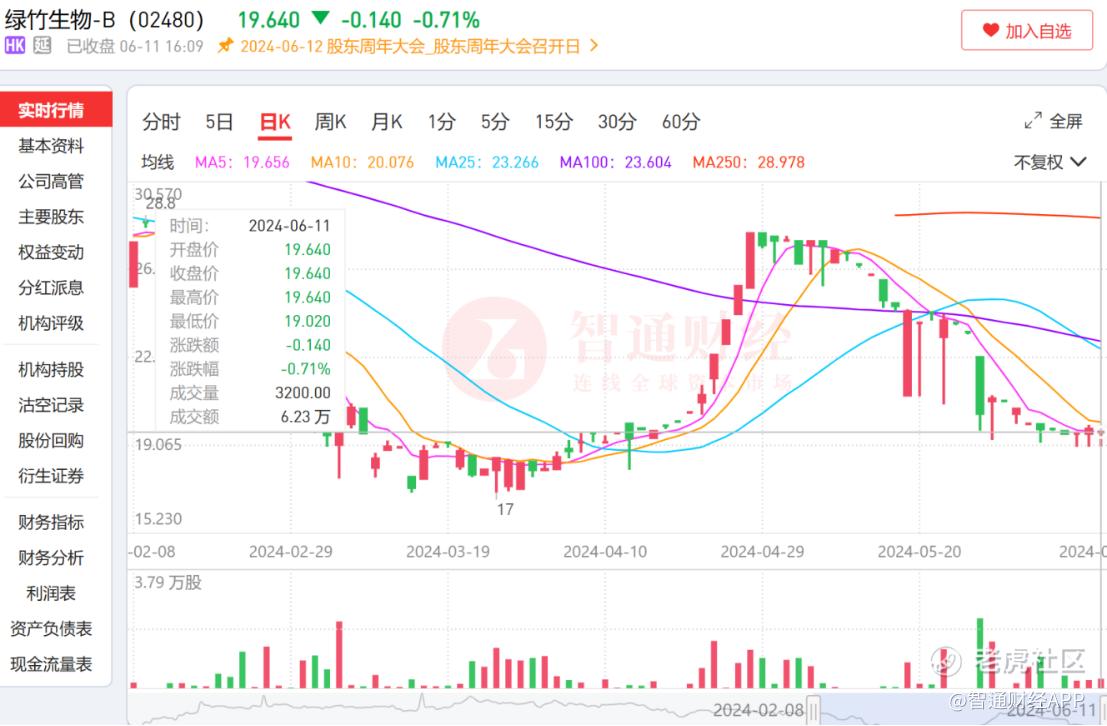 虽然绿竹生物股价在4月份又重新爬回最高28.3港元,57.2亿港元市值也重新触摸港股通门槛,但绿竹生物股价再次“没憋住”,又快速跌至20港元以下,截至6月11日,绿竹生物的股价为19.64港元,当日成交量仅3200股。从成交量也能看出加入港股通对于绿竹生物的重要性。