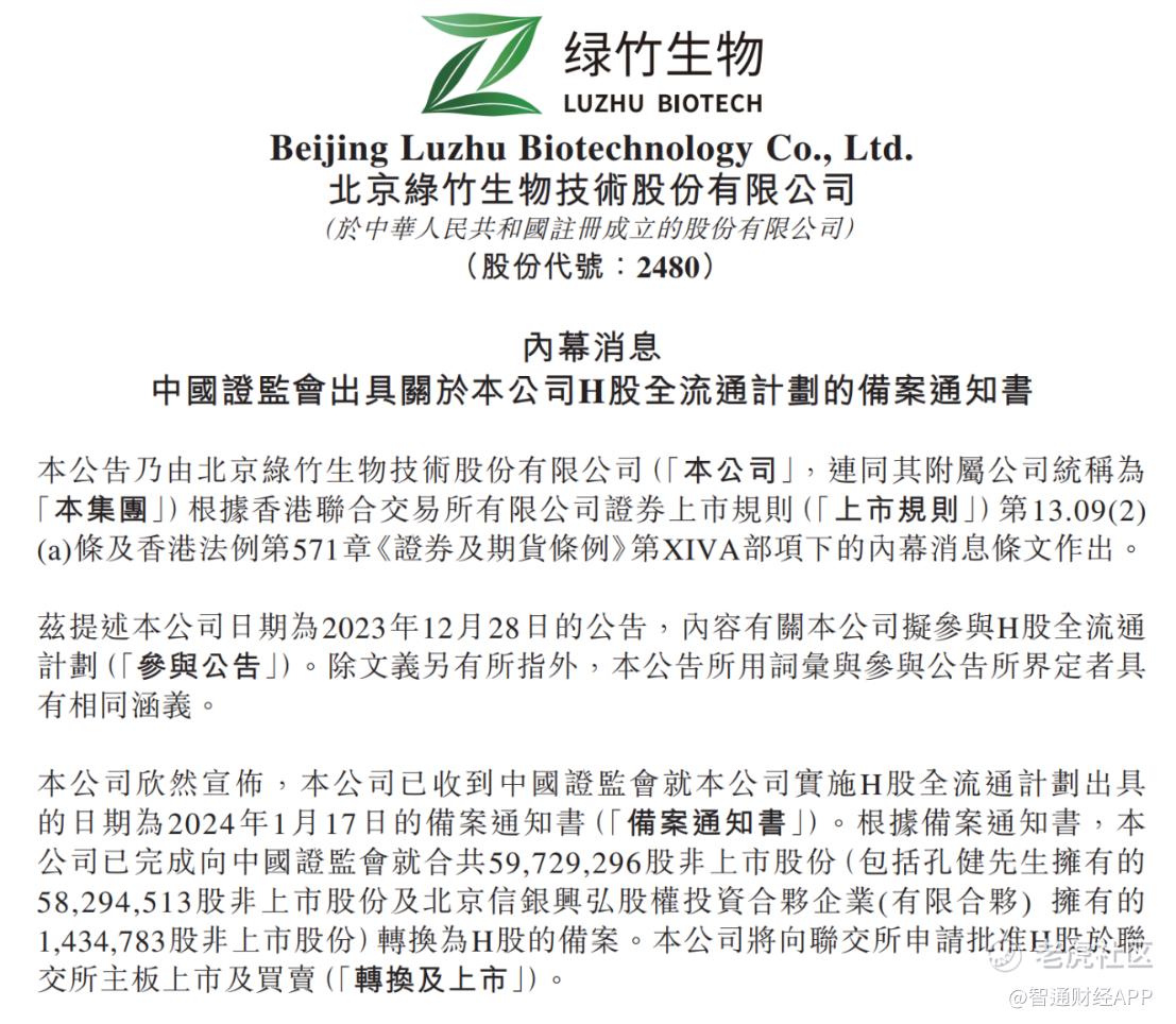 今年1月17日,绿竹生物-B(02480) $绿竹生物-B(02480)$ 发布一则公告,其申请的境内未上市全流通已获批备案通知书。正如公告中提到,公司拟将2名股东所持合计5972.9万股境内未上市股份转为境外上市股份,并在香港联合交易所上市流通。