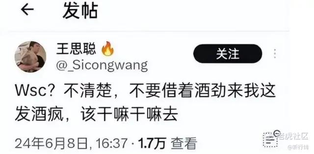 王思聪在社交平台发帖:“Wsc?不清楚,不要借着酒劲来我这发酒疯,该干嘛干嘛去。”