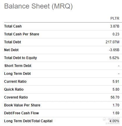 Palantir的运营杠杆是投资者看好该股的关键原因之一。毛利率从79.5%增长至81.7%。营业利润率表现非常好,同比增长从0.8%增至12.8%。强劲的经营杠杆使Palantir在本季度产生了8300万美元的自由现金流。另一方面,如果我们扣除1.26亿美元的股票薪酬,上一季度的FCF将变为负值。尽管如此,Palantir的资产负债表仍是一座堡垒,拥有39亿美元的现金储备,几乎没有债务。公司的财务灵活性是其根本优势,因为它增加了推动有机增长、收购和投资创新的潜力。