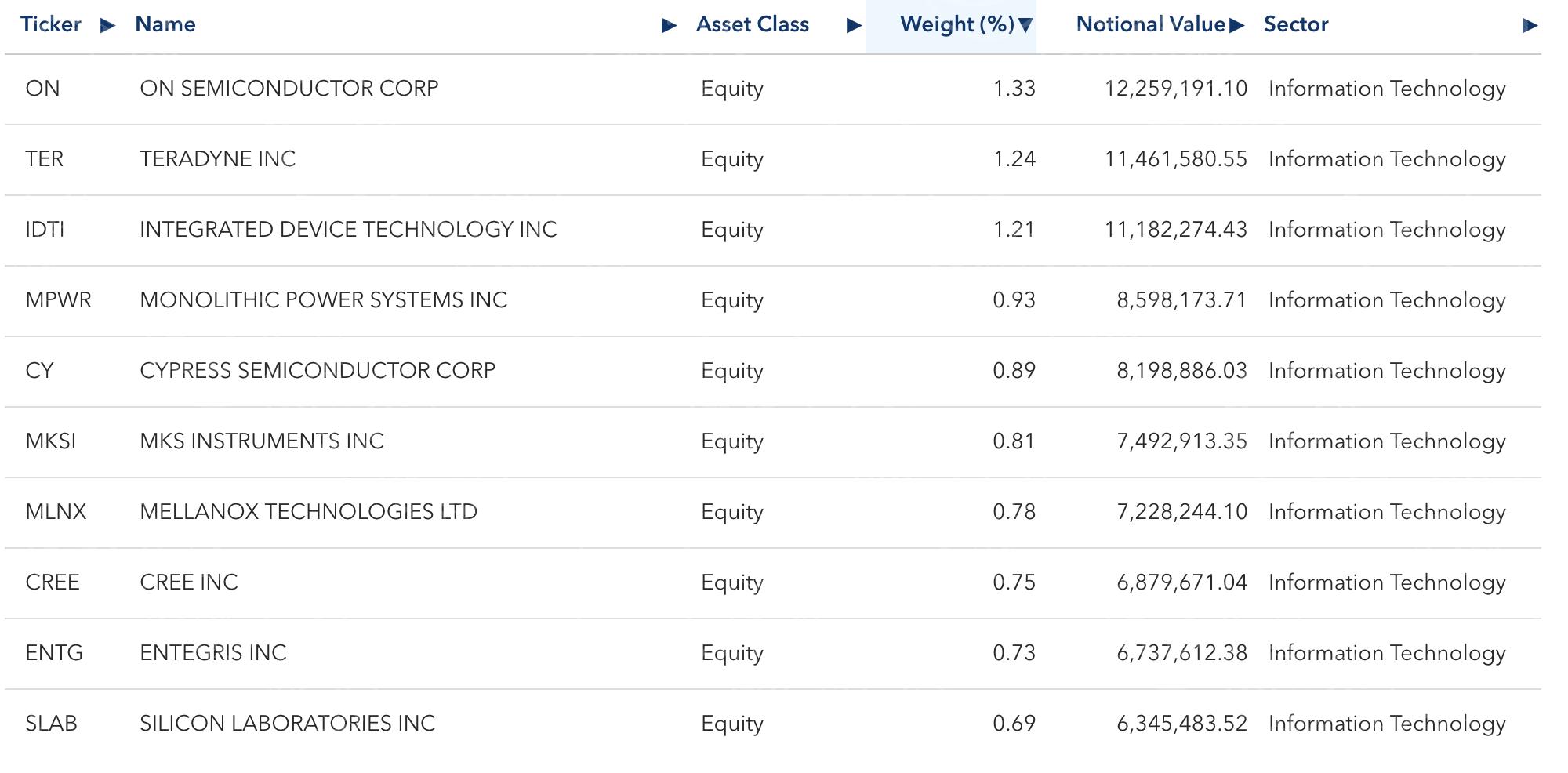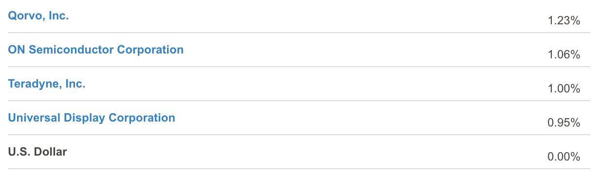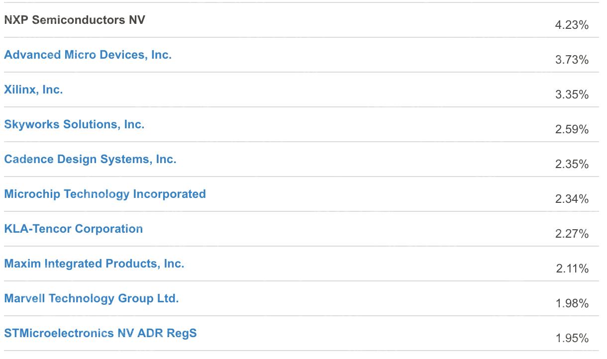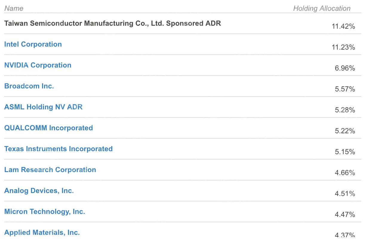 最大成分股依次是台积电$(TSM)$、英特尔、英伟达、安华高科、高通、阿斯麦$(ASML)$