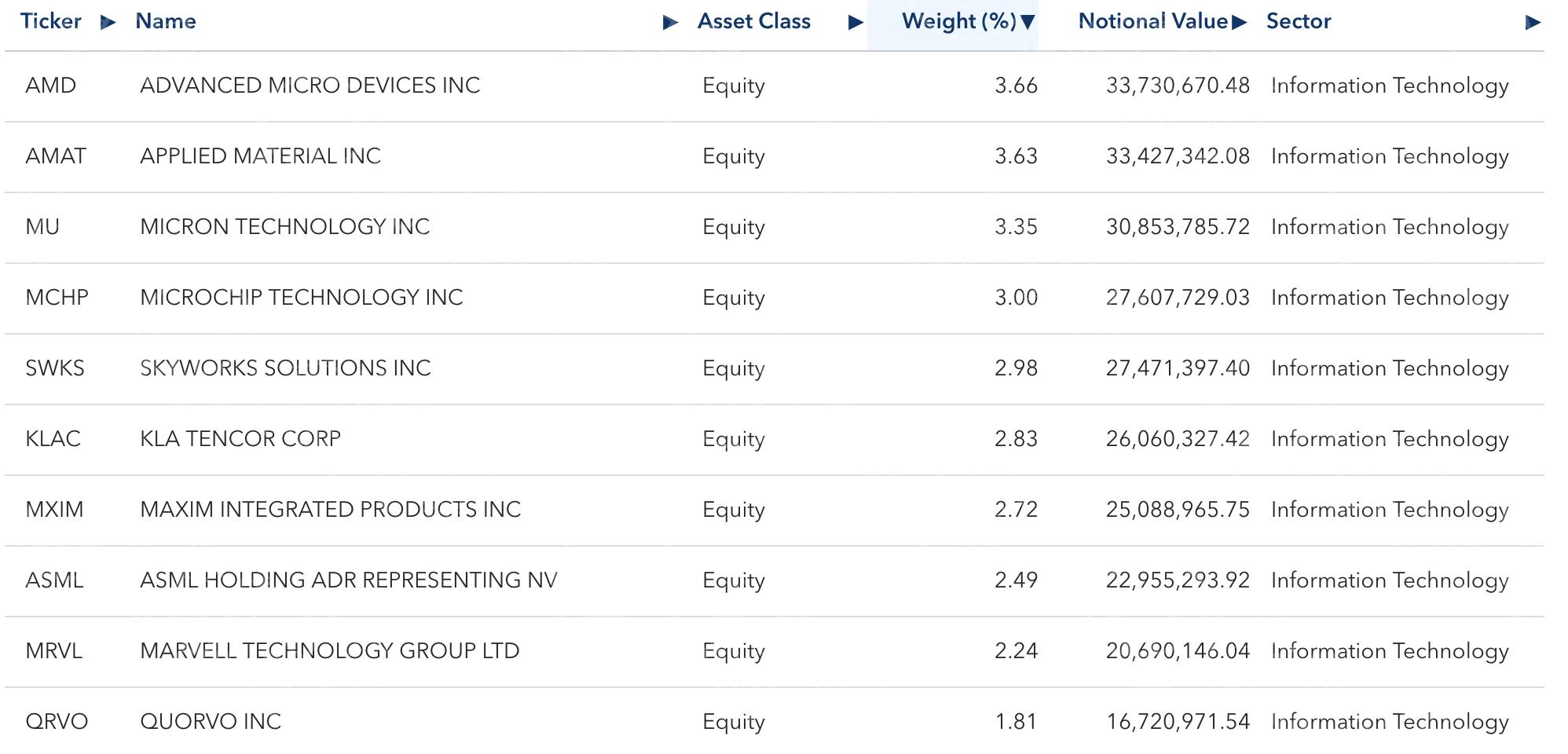 SOXX是Blackrock发行的,跟踪指数是费城半导体行业指数(PHLX Semiconductor Sector Index),持有30只股票如下图,最大成分股依次是$安华高科(AVGO)$、高通$(QCOM)$、$英特尔(INTC)$、$德州仪器(TXN)$、$英伟达(NVDA)$。