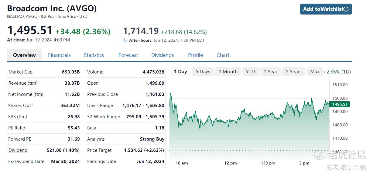 今年博通股价已经上涨了34%,而2023全年股价上涨了近100%,相比之下,费城半导体指数上涨了34%。截止发稿时,盘前股价上涨14.09%至1706美金。