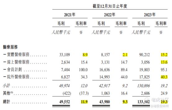 首先,毛利率这一块就落后了一大截。卓正医疗线下的实体医疗机构过去3年的毛利率分别约8.9%、2.1%及15.2%,固然有疫情因素,但2023年恢复后也只有约15.2%,算得上很低了。