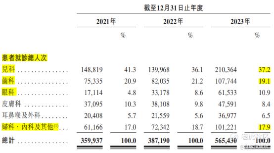 卓正医疗走的高端路线,采取的就是所谓家庭医疗模式,会员机制,一个会员可以覆盖6个成员,给予全家人最全面的医疗服务。且公司是线下、线上一体化运营模式,旗下的诊所覆盖了:儿科、齿科、眼科、皮肤科、耳鼻喉及外科、妇科及内科等多个专科,还有若干较热门的亚专科,强调的就是提供一站式全面的医疗服务。下图为公司线下实体医疗机构的各专科的就诊人次。