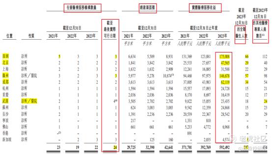 收入构成方面,深圳、广州、成都、北京、上海排名靠前,单深圳一地3家诊所的收入贡献就接近30%,全职医生数量也是最多的,达到66名。广州有1家医院2家诊所,但广州的全职医生人数才57名。武汉方面1医院+3诊所,而全职医生人数却只有18名,猜想单店的规模并不大。新加坡虽然号称有3家诊所,但2023年收入贡献仅457.4万元,全职医生人数也只有3人(且并无其他医护人员)。