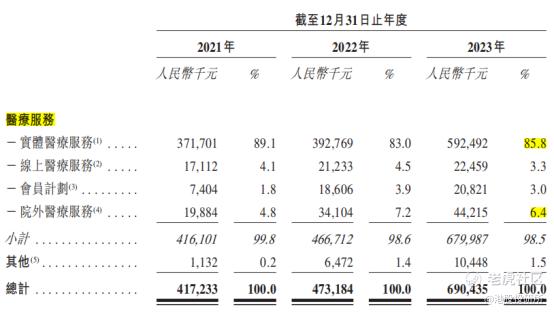 首先,实体医疗服务就是线下的医疗服务机构,主要就是提供门诊服务及药品、器械等,2023年收入占比超过85%,是绝对的大头。线上医疗服务则依托公司的线上平台“卓正医疗”,提供若干如线上预约、问诊等服务,收入占比约3.3%。