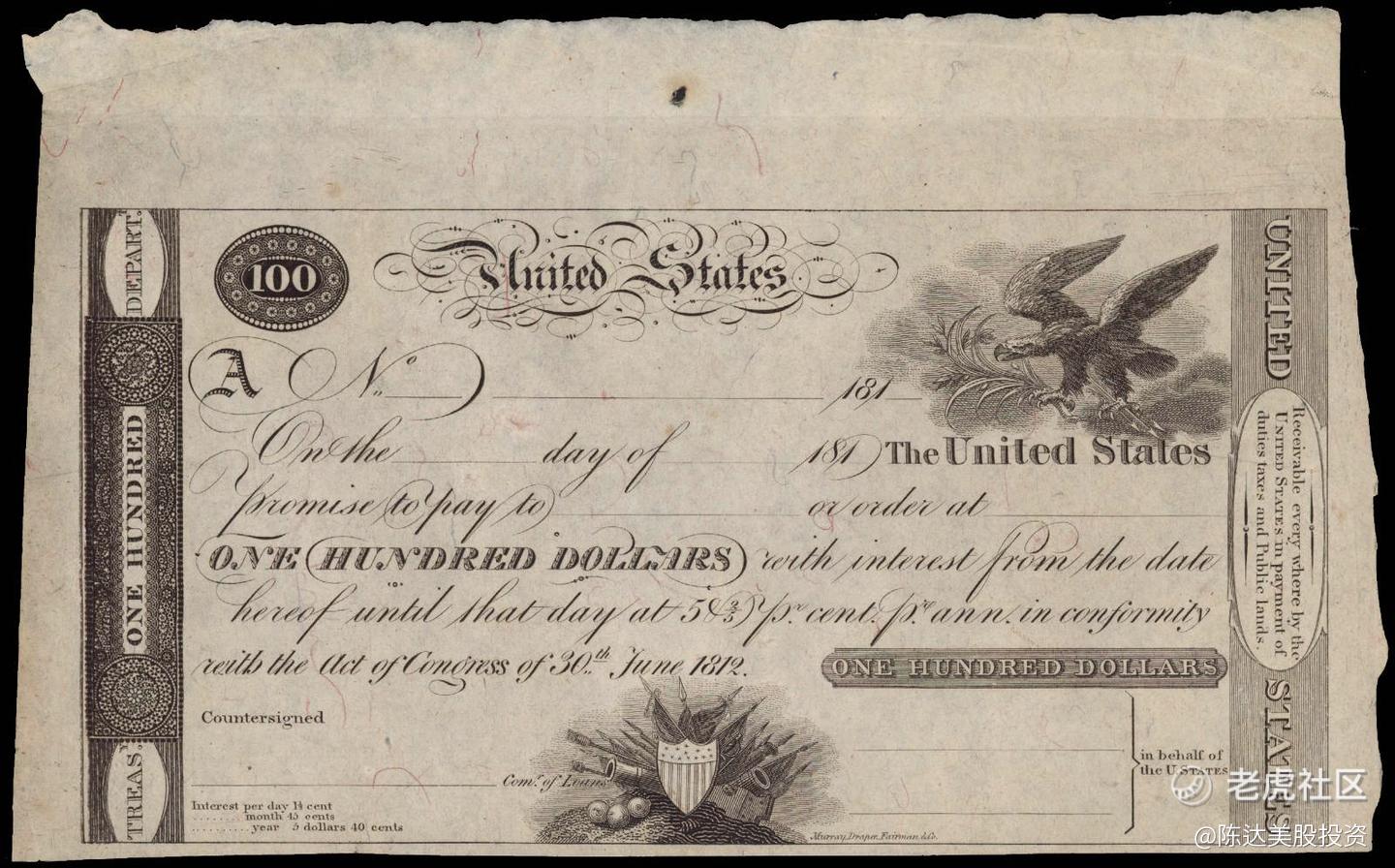 (上图:美国早期国债,根据1812年法案发行的短期国债凭证。期限、受让人等均为空白可填写,年利率5.4%。)