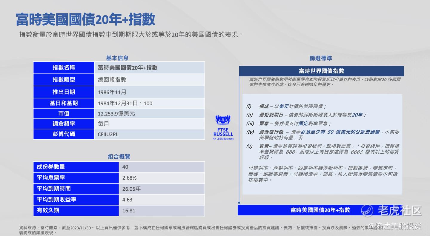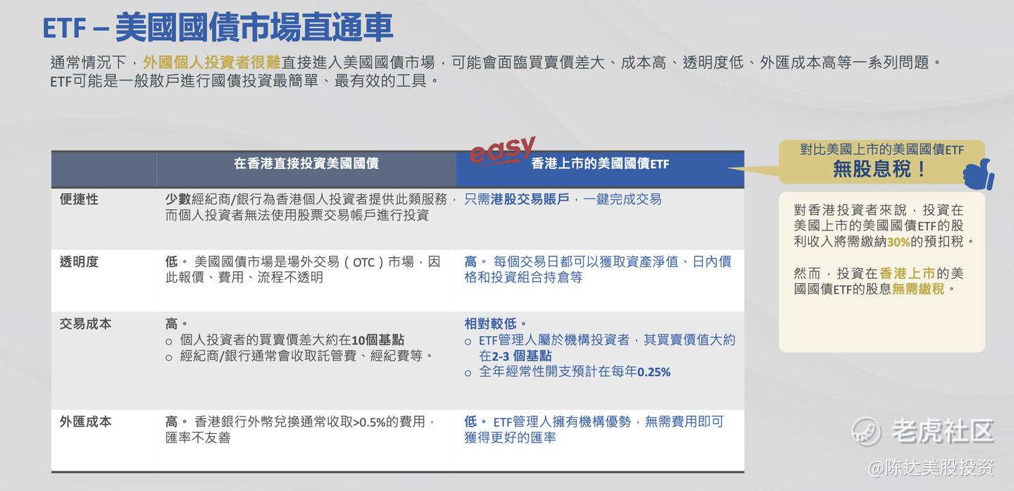美股市场有TLT,而港股市场有南方东英富时美国国债20年+指数ETF(3433.HK);几乎复制策略,一个久期16.5年,另一个人久期16.8年,risk profile(风险侧写)非常接近。港股3433还有个好处,交易成本低,另外相比TLT派息的税务预扣(香港投资者预扣30% 内地投资者预扣10% ),3433并不会有税务预扣的忧虑。