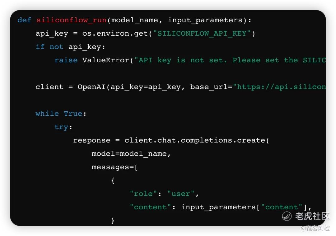 为了与SiliconFlow API进行交互,我们定义了一个函数:siliconflow_run,这个函数通过API密钥与SiliconFlow进行通信,发送请求并接收响应: