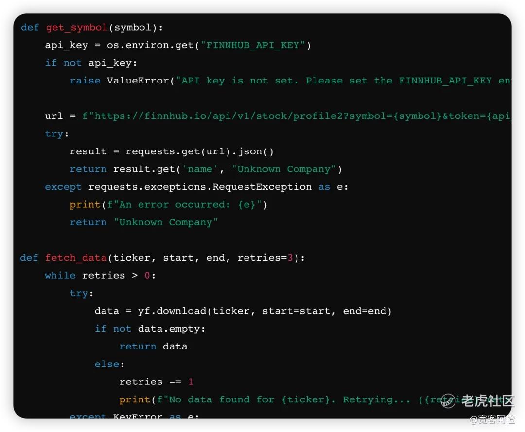 通过Streamlit的侧边栏,我们获取用户输入的股票代码和日期。这部分代码允许用户通过Web界面输入参数。我们定义函数获取股票名称和股票数据,这些函数通过API获取股票名称和股票数据,并实现了重试机制。