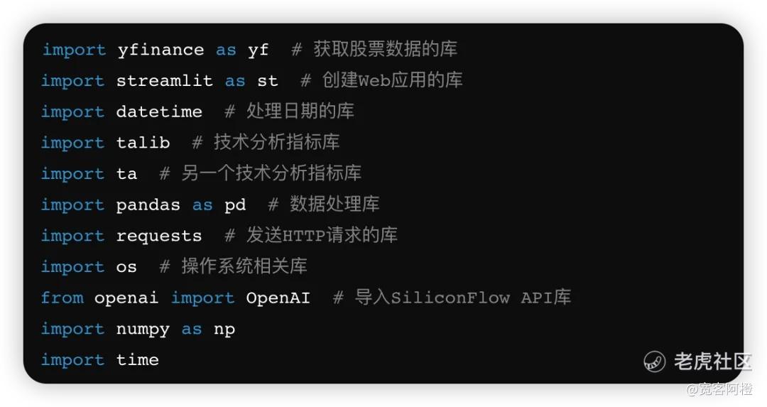 yfinance帮助我们实现股票数据获取,tablib是一个处理股票数据并进行技术指标计算的Python库、streamlit可以实现API交互以及Web界面展示等功能。