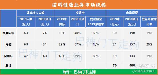 行业:公司业务为提供癌症筛查在中国范围内的应用,目前在结直肠癌领域已经有成熟的产品(常卫清),是中国首个且唯一一款获国家药监局批准的分子癌症筛查测试,同时在胃癌和宫颈癌领域进行布局研发。结直肠癌/胃癌/宫颈癌筛查领域,受益于庞大的潜在用户和当前较低的渗透率、以及参照发达国家高渗透率的历史经验,可能在未来成长为一个庞大的市场(2030年预计488亿元)