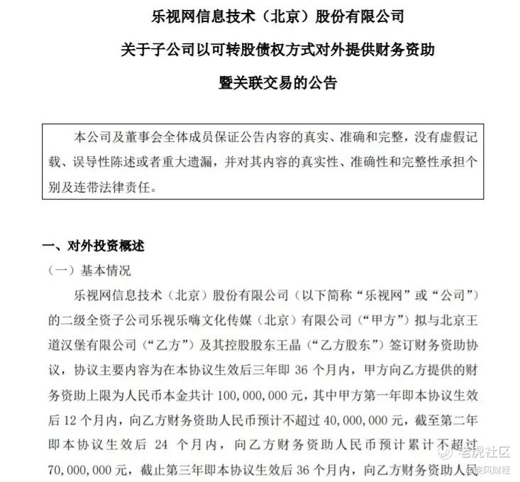 并且这笔投资也并非入股,根据公告中的说法,乐视乐嗨的这次投资不光被定性为了“财务资助”,最关键的是还有利息收入。“财务资助年利率最高采用本协议生效后中国人民银行最近公布的贷款市场五年期报价利率(LPR)(单利)计算利息,按实际财务资助金额发生时长计算利息,资助期限最长为5年,到期后乙方向甲方一次性支付未转股本息。”