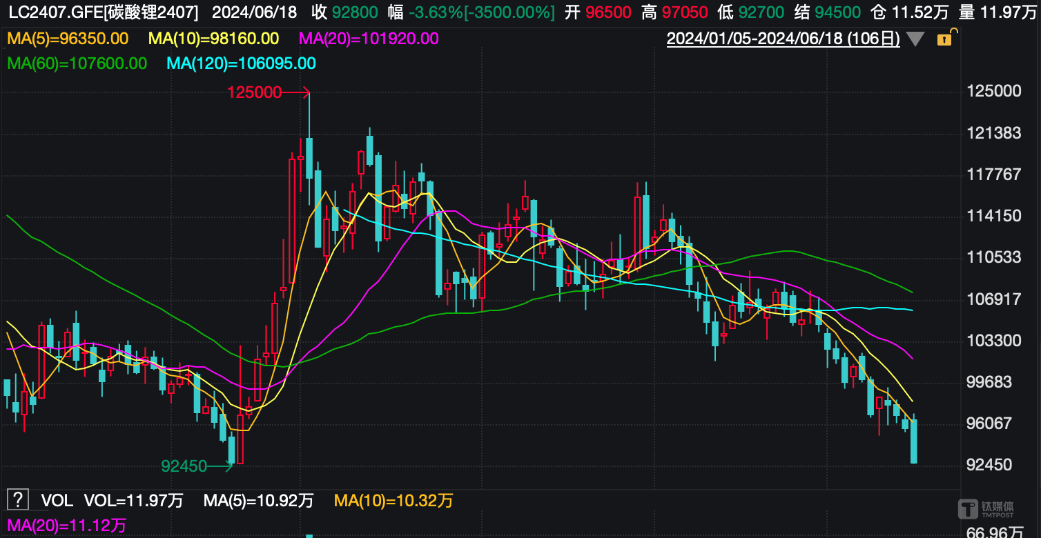 期货方面,以碳酸锂2407合约为例,6月11日收9.70万元/吨,到6月18日已经降至9.28万元/吨,当日跌3.63%。