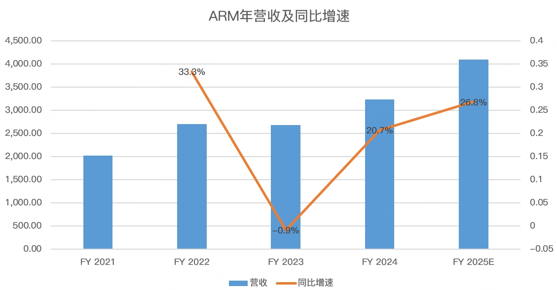 根据最新的指引,ARM2025财年(截止2025年3月31日的年度业绩)的营收在38-41亿美元之间,按最高值计算,同比增速为26.8%,虽然较之前两年有明显提升,但相比英伟达当下208%的营收增速,并不算高: